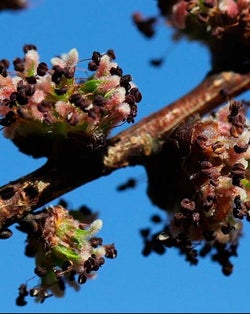 Ses nombreuses petites fleurs rougeâtres éclosent de février à avril.